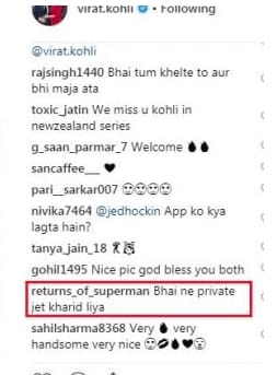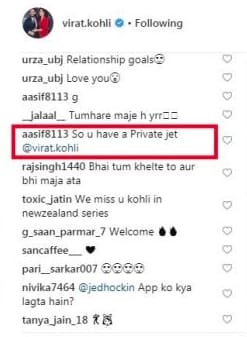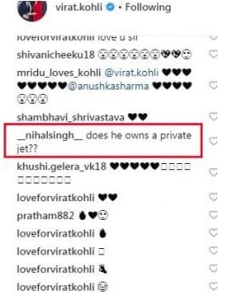विराट कोहली ने अपने सोशल मीडिया अकाउंट पर अनुष्का के साथ एक फोटो शेयर की है जिसमें वो प्राइवेट जेट के सामने खड़े होकर पोज दे रहे हैं। विराट कोहली के तस्वीर शेयर करने के बाद उन्हें सोशल मीडिया पर ट्रोल किया जाने लगा और यूजर्स ने कई कमेंट्स किए। एक यूजर ने लिखा, 'तो क्या आपके पास प्राइवेट जेट है।'