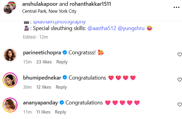 अंशुला ने आगे लिखा है, 'मैं अपने सबसे अच्छे दोस्त से सगाई कर रही हूं! मेरा सबसे सुरक्षित ठिकाना। मेरा अपना। मेरा पसंदीदा शख्स, पसंदीदा शहर… और अब, मेरा पसंदीदा हां'! अंशुला ने आगे लिखा है, 'हमारी पहली मुलाकात बर्गर के प्यार के ईर्द-गिर्द थी, इसलिए सगाई के बाद पहला मील'। अंशुला को फैंस बधाईयां दे रहे हैं। इसके अलावा परिणीति चोपड़ा, भूमि पेडनेकर और अनन्या पांडे जैसे सितारों ने भी अंशुला को नए सफर के लिए शुभकामनाएं दी हैं।