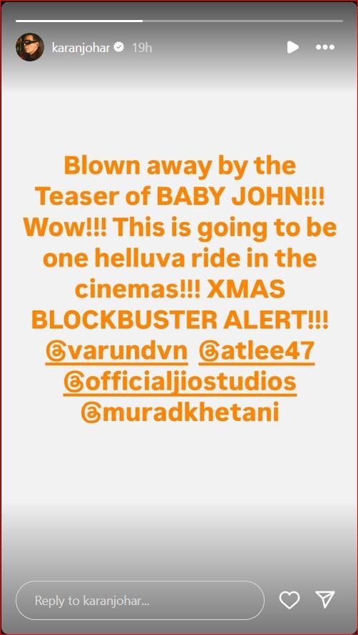 करण ने अपने इंस्टाग्राम स्टोरीज पर लिखा, "बेबी जॉन के टीजर से हैरान हूं। वाह, सिनेमाघरों में यह एक शानदार सफर होने वाला है। हेलुवा राइड, क्रिसमस ब्लॉकबस्टर अलर्ट। @varundvn Catlee47 @officialjiostudios @muradkhetani।"