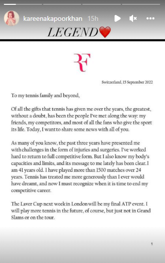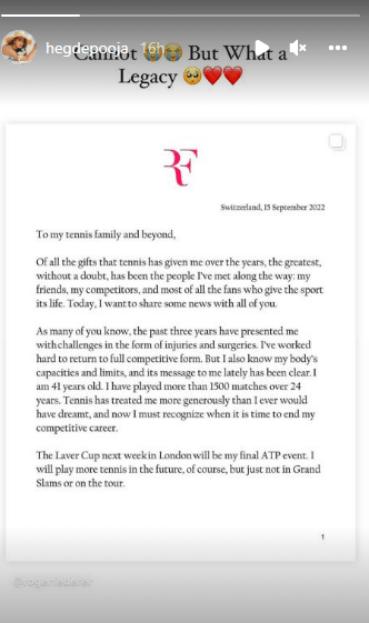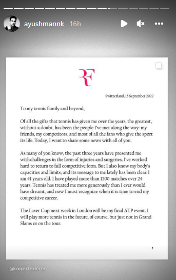 दिग्गज टेनिस खिलाड़ी और 20 बार के ग्रैंड स्लैम विजेता रोजर फेडरर ने गुरुवार को घोषणा की कि वह लंदन में लेवर कप के बाद संन्यास ले लेंगे। 41 साल रोजर ने सोशल मीडिया पर अपनी भावनाओं को व्यक्त करते हुए एक लंबा नोट साझा किया। उन्होंने कहा- 'मैंने 24 वर्षों में 1500 से ज्यादा मैच खेले और टेनिस ने मेरे साथ पहले से कहीं ज्यादा उदार व्यवहार किया है, जितना मैंने सपने में भी नहीं देखा होगा'। फेडरर की घोषणा के बाद उनके फैंस का दिल टूट गया और खेल जगत में उनके महान योगदान को याद किया जाने लगा। इस खास मौके पर बॉलीवुड सेलेब्स ने भी उनके अनाउंसमेंट पर निराशा जताई और फेडरर की टेनिस जर्नी को याद किया गया।