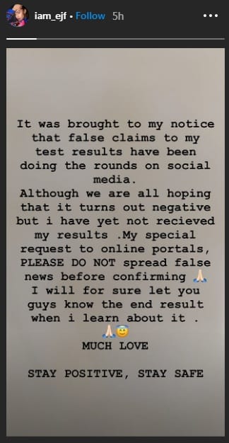 एरिका फर्नांडिस ने अपने आधिकारिक इंस्टाग्राम अकाउंट की स्टोरी पर एक नोट साझा किया है। जिसमें उन्होंने इस तरह की अफवाह को फर्जी बताया है। साथ ही इस बात का भी खुलासा किया है कि उन्होंने अपना कोविड-19 का टेस्ट करवाया है, लेकिन अभी तक रिपोर्ट नहीं आई हैं। एरिका फर्नांडिस ने अपने पोस्ट में लिखा, 'मेरे संज्ञान में ऐसे खबर आई है कि मेरी रिपोर्ट को लेकर सोशल मीडिया पर झूठी खबरें चलाई जा रही हैं।'