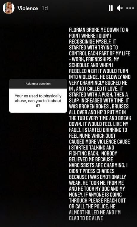 हियावी ने सोशल मीडिया पर पोस्ट के साझा कर बताया है कि फ्लोरियन ने उनकी जिंदगी बर्बाद कर दी थी। वहीं, जब एक यूजर के पूछे जाने पर हियावी ने बताया, 'फ्लोरियन ने मुझे उस हद तक पहुंचा दिया था कि मैं खुद को पहचानना भी छोड़ चुकी थी। पहले उसने में मेरी लाइफ पर कंट्रोल करने की कोशिश की। जब इसका विरोध किया तो मारा। यह मामला थप्पड़ से आगे बढ़ कर हड्डियां टूटने तक जा पहुंचा। मुझे चोट के निशान मिले, कई बार लगा कि कहीं मैं तो गलत नहीं। मैंने पीना शुरू कर दिया जिससे यह और बढ़ गया।'