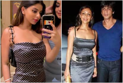 दरअसल कई साल पहले गौरी खान को भी ऐसी ही ड्रेस पहने देखा गया था। दोनों में अंतर केवल इतना है कि गौरी ने ड्रेस के साथ बेल्ट पहना है और सुहाना ने बेल्ट नहीं पहना। जिस वजह से फैंस ये सवाल कर रहे हैं। गौरी ने ये ड्रेस शाहरुख की फिल्म 'ओम शांति ओम' में अपनी मौजूदगी दर्ज कराते समय पहनी थी।