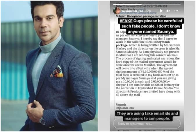 इस स्क्रीनशॉट को साझा करते हुए राजकुमार ने कैप्शन में लिखा, ‘सभी लोग कृपया करके ऐसे फर्जी लोगों से सावधान रहें। मैं किसी भी सौम्या नाम की शख्स को नहीं जानता। वह लोग फर्जी ईमेल आईडी और मैनेजर का इस्तेमाल लोगों से पैसे ठगने के लिए कर रहे हैं।’ अभिनेता के शेयर किए गए इस स्क्रीनशॉट में लिखा था ‘हाय अर्जुन! आपकी और मेरी मैनेजर सौम्या से हमारी आखिरी बातचीत के मुताबिक, मैं कहना चाहता हूं कि ‘हनीमून पैकेज’ नाम की फिल्म को करने के लिए मैं पूरी तरह से सहमत हूं, जिसे मिस्टर संतोष मास्की लिख रहे हैं और क्रू में भी डायरेक्टर मिस्टर संतोष मास्की है। इस समय मैं मुंबई में अपस्थित नहीं हूं, इसलिए मैं मेल पर ही अपनी सहमति भेज रहा हूं।’