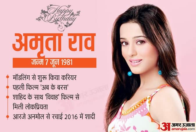 'इश्क-विश्क', 'मैं हूं ना', 'विवाह' और 'जॉली एल एल बी' जैसी फिल्मों में अपने अभिनय के लिए मशहूर अभिनेत्री अमृता राव का 7 जून को जन्मदिन है। हालांकि अमृता का बॉलीवुड करियर कुछ खास नहीं रहा लेकिन गिनती की फिल्में करने के बाद भी उन्होंने अच्छा खासा मुकाम हासिल किया है। हिंदी फिल्मों के बाद उन्होंने तेलुगू सिनेमा का रुख भी किया। अमृता राव के जन्मदिन पर आइए जानते हैं उनसे जुड़ी कुछ दिलचस्प बातें।
