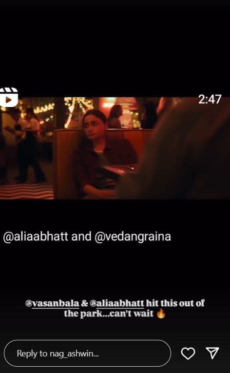 उन्होंने इंस्टाग्राम स्टोरी पर टीजर को साझा करते हुए लिखा, "वासन बाला और आलिया भट्ट ने इसे मैदान से बाहर कर पहुंचा दिया है... इस फिल्म के लिए अब और इंतजार नहीं कर सकता।" निर्देशक की तारीफ पर आलिया ने भी प्रतिक्रिया दी है। उन्होंने स्टोरी साझा करते हुए नाग अश्विन को शुक्रिया कहा है।