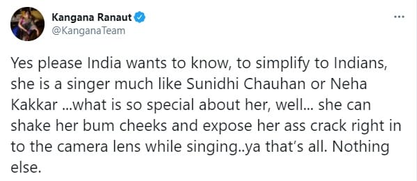 कंगना ने अपने ट्वीट में रिहाना को आम सिंगर बताया है। उन्होंने लोगों से पूछा है कि रिहाना में खास क्या है। कंगना ने अपने ट्वीट में लिखा, 'हां जरूर भारत जानना चाहता है, भारतीयों को समझने के लिए आसान शब्दों में, वो (रिहाना) सुनिधि चौहान और नेहा कक्कड़ की तरह ही एक सिंगर है। उसमें खास क्या है।' इसके अलावा कंगना ने रिहाना के लिए कुछ आपत्तिजनक शब्दों का इस्तेमाल भी किया है।