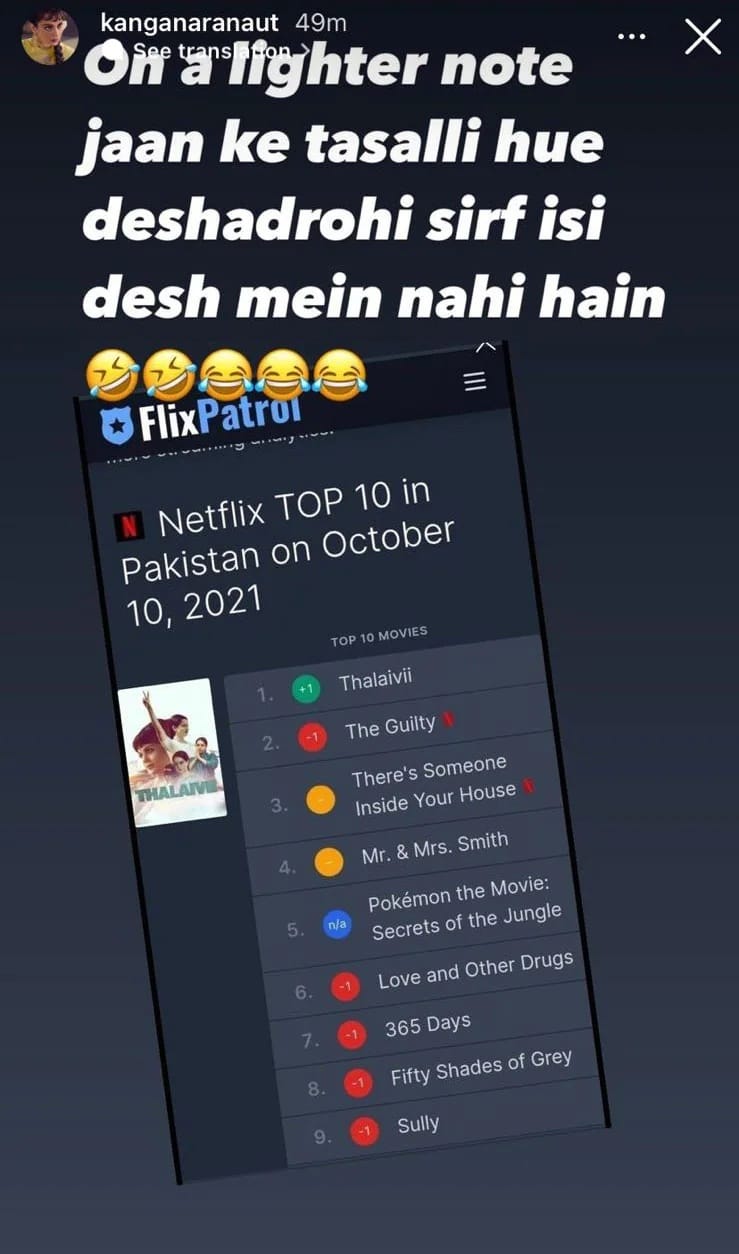 कंगना ने लिखा, 'थलाइवी पाकिस्तान समेत कई देशों में टॉप पर ट्रेंड कर रही है। कला की कोई सीमा नहीं होती। भारत के तरफ से ढेर सारा प्यार'। उन्होंने मजाकिया अंदाज में ये भी लिखा कि 'जानकर तसल्ली हुई, देशद्रोही सिर्फ इसी देश में नहीं हैं। उन्होंने अपने इस कैप्शन के साथ हंसने वाले इमोजी भी पोस्ट किए हैं।