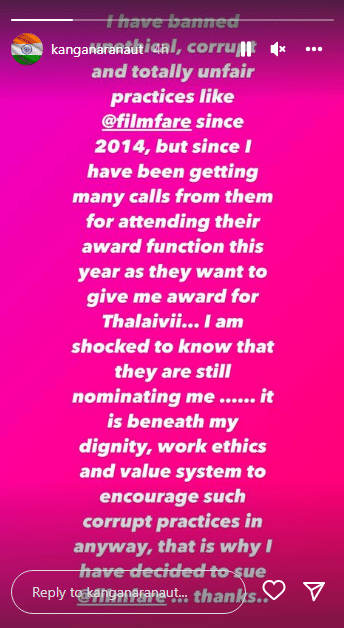 कंगना रणौत ने इंस्टाग्राम पर एक स्टोरी शेयर करते हुए लिखा, आखिरकार मैगजीन ने मेरी नॉमिनेशन वापस ले लिया है। इस भ्रष्ट सिस्टम के खिलाफ मेरी लड़ाई में साथ देने के लिए सभी का धन्यवाद। हालांकि, ये मुझे मैगजीन के खिलाफ कानूनी कार्रवाई करने से नहीं रोक सकती। मेरी कोशिश है इस तरह की अनैतिक प्रथाओं खत्म करना और ऐसे दुर्भावनापूर्ण अवॉर्ड शो को रोकना है। कोर्ट में मिलते हैं। अपने इस पोस्ट में एक्ट्रेस ने मैगजीन को भी टैग किया है।