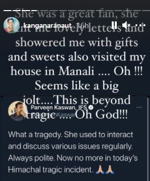 कंगना ने इंस्टा पर लिखा, 'वो बहुत बड़ी फैन थी। वो मुझे फूल, खूबसूरत खत, तोहफे और मिठाईयां भेजा करती थी। वो मुझसे मिलने मेरे मनाली वाले घर पर भी आईं थी। ओह, ये किसी बड़े दुख जैसा है। दुख से भी आगे...हे भगवान'।