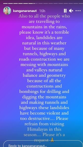 कंगना ने इसके आगे एक और पोस्ट साझा कर लोगों को पहाड़ घूमने आने के लिए मना किया। कंगना ने लिखा, 'जो लोग बरसात में पहाड़ घूमने का प्लान बना रहे हैं उन्हें बता दूं कि इस मौसम में लैंड स्लाइड होते रहते हैं। जिस तरह से इंसान ने प्रकृति से छेड़छाड़ की है ये और भी और भी भयानक हो गया है। मेरी अपील है कि वो इस मौसम में पहाड़ घूमने ना आएं'।