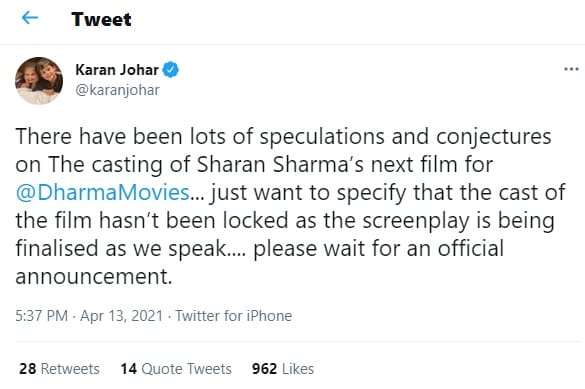 बीते दो दिन से कार्तिक आर्यन को लेकर एक खबर ये ‘प्लांट’ कराने की कोशिशें चल रही हैं कि धर्मा प्रोडक्शंस ने उन्हें क्रिकेट पर बन रही एक फिल्म के लिए फाइनल कर लिया है। फिल्म का निर्देशक ‘गुंजन सक्सेना’ वाले शरन शर्मा को बताया गया। फिल्म की हीरोइन के लिए तृप्ति डिमरी का नाम भी उछला। लेकिन, दो दिन से गुब्बारे में भरी जा रही हवा में मंगलवार को करण जौहर ने सुई चुभो दी। उन्होंने एक ट्वीट करके साफ कर दिया कि शरन शर्मा की फिल्म को लेकर कोई कलाकार अभी तक फाइनल नहीं हुआ है।