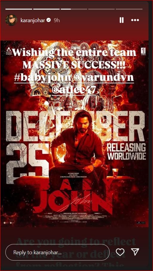 करण ने अपनी इंस्टाग्राम स्टोरीज पर बेबी जॉन का एक पोस्टर शेयर किया और लिखा, "पूरी टीम को भारी सफलता की शुभकामनाएं। क्या आप साल पर कुछ सोच रहे हैं? इस पर वरुण धवन ने प्रतिक्रिया के तौर पर दिल के इमोजी शेयर किए। फिल्म की पूरी कास्ट बैक-टू-बैक इसके प्रमोशन में जुटी हुई है। हाल ही में वरुण धवन और वामिका गब्बी ने अपने पारंपरिक लुक से सभी का ध्यान खींचा।