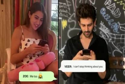 फिल्म 'लव आज कल' सोशल मीडिया पर लगातार चर्चा में बनी हुई है। फिल्म में सारा और कार्तिक की रोमांटिक केमिस्ट्री युवाओं को खूब भा रही है। फिल्म में दो जमाने (1990 और 2020) के पहले प्यार की कहानी को पेश किया गया है, जिसे लेकर दर्शक आकर्षित हो रहे हैं। बीते दिनों पहला ट्रेलर सामने आने के बाद दर्शक फिल्म के गाने 'शायद' को लेकर बेसब्री से इंतजार कर रहे हैं। कार्तिक आर्यन और सारा अली खान ने इस गाने का टीजर साझा किया है। इस टीजर में जोइ (सारा) और वीर (कार्तिक) एक दूसरे से चैटिंग करते हुए दिख रहे हैं।