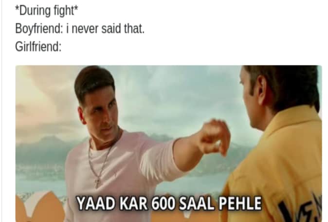 CHEEKU नाम के ट्विटर हैंडल ने ब्वॉयफ्रेंड-गर्लफ्रेंड की लड़ाई से जोड़ते हुए लिखा, 'ब्वॉयफ्रेंड- मैंने ऐसा कब कहा, गर्लफ्रेंड- यादकर 600 साल पहले।' sir-kid ने लिखा- 'जब स्टूडेंट साइंस सब्जेक्ट लेते हैं और 12वीं के बाद इंजीनियरिंग पसंद करते हैं। इसके साथ अक्षय कुमार का डायलॉग लिखा है- मेरी तब भी लगी थी और मेरी अब भी लगेगी है।' इसके अलावा सोशल मीडिया पर 'हाउसफुल 4' से जुड़े और भी कई मीम्स वायरल हो रहे हैं।