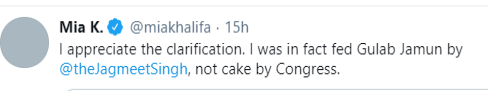 दरअसल मिया खलीफा की फोटो एडिट करके लगाई गई थी। फोटो राहुल गांधी के 37वें जन्मदिन की थी जब पार्टी के कार्यकर्ता उनकी तस्वीर को केक खिला रहे थे। मिया ने फैक्ट चेक का एक ट्वीट साझा करते लिखा- ‘मैं इस सच्चाई की सराहना करती हूं। मुझे कांग्रेसियों ने केक नहीं खिलाया था बल्कि जगमीत सिंह द्वारा गुलाब जामुन खिलाया गया था।‘ बता दें कि कुछ दिनों पहले मिया ने एक वीडियो साझा किया था जिसमें वह गुलाब जामुन और बिरयानी खा रही थीं।