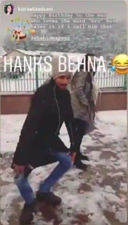 कियारा आडवाणी ने शाहिद कपूर के साथ फनी वीडियो अपनी इंस्टा-स्टोरी में शेयर किया। जिसमें दोनों डांस करते नजर आए। उन्होंने शाहिद को भाई बताते हुए जन्मदिन की बधाई दी। पता हो कि कियारा आडवाणी और शाहिद इन दिनों अपनी आने वाली फिल्म 'कबीर सिंह' की शूटिंग में व्यस्त हैं। यह फिल्म तेलुगु फिल्म 'अर्जुन रेड्डी' का रीमेक है।