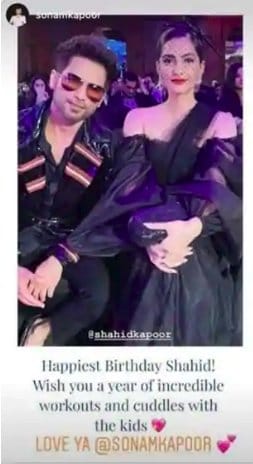 अभिनेत्री सोनम कपूर ने भी इंस्टाग्राम पर शाहिद के साथ तस्वीर साझा करते हुए उन्हें जन्मदिन की बधाई दी। इंस्टा-स्टोरी में शेयर की गई इस तस्वीर में शाहिद और सोनम ब्लैक कलर की ड्रेस में नजर आ रहे हैं। पता हो कि सोनम कपूर और शाहिद कपूर ने साल 2011 में आई फिल्म 'मौसम' मुख्य भूमिका निभाई थी।