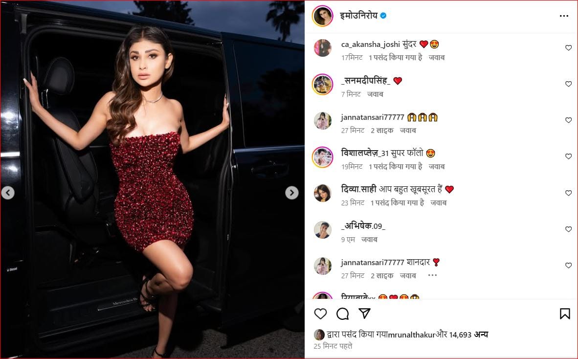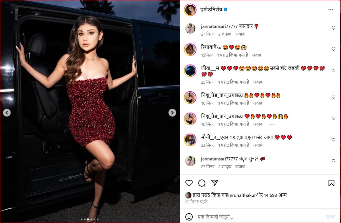 मौनी के इस लेटेस्ट लुक पर फैंस जमकर प्यार बरसा रहे हैं। एक फैन ने लिखा, 'क्रश', एक और फैन ने लिखा, 'हॉट', एक और फैन ने लिखा, 'शानदार', एक और फैन ने लिखा, 'बहुत प्यारा', एक और फैन ने लिखा, 'आप बहुत खूबसूरत हैं', एक और फैन ने लिखा, 'सबसे हॉट।'