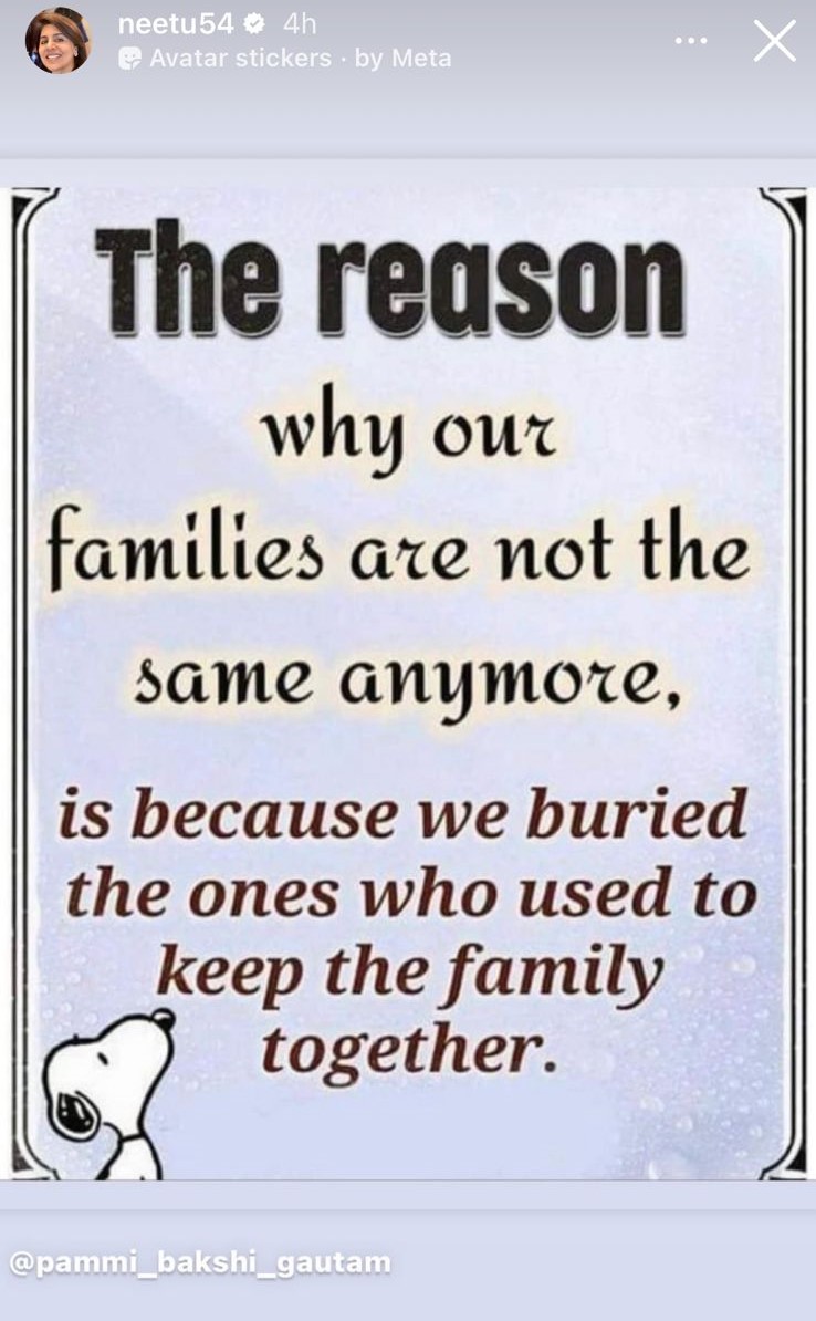 चलिए पहले जानते हैं कि आखिर नीतू कपूर ने सोशल मीडिया पर क्या शेयर किया है। अभिनेत्री ने अपने हालिया पोस्ट से सभी को चिंता में डाल दिया है। हाल ही में नीतू कपूर ने अपनी इंस्टाग्राम स्टोरीज पर एक क्रिप्टिक नोट साझा किया, जिसमें लिखा था कि, 'अब उनके परिवार पहले जैसे नहीं रह गए हैं।' पोस्ट में लिखा है, 'हमारे परिवार अब पहले जैसे नहीं रहे, इसका कारण यह है कि हमने उन लोगों को दफना दिया जो परिवार को एक साथ रखते थे।' नीतू ने पोस्ट तो साझा की, लेकिन इसके कैप्शन में कुछ भी नहीं लिखा।