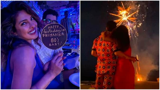निक जोनस ने अपने सोशल मीडिया अकाउंट पर प्रियंका के बर्थडे सेलिब्रेशन की चार तस्वीरें अपलोड की हैं। पहली फोटो में दोनों समुंदर किनारे खड़े होकर एक-दूसरे को किस कर रहे हैं। दूसरी तस्वीर में प्रियंका किसी रेस्टोरेंट में बैठी हैं और उनके हाथ में हैप्पी बर्थडे प्रियंका 80's बेबी का एक टैग है। तीसरी तस्वीर में निक एक टॉवल जैसा कपड़ा पकड़े हैं, जिस पर लिखा है- प्रियंका ज्वेल ऑफ जुलाई। वहीं आखिरी फोटो में निक- प्रियंका आतिशबाजी का मजा ले रहे हैं।