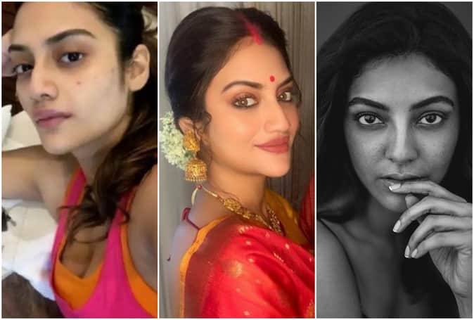 कोलकाता के दुर्गा पूजा पंडाल में हाल ही में कई सितारे स्पॉट हुए। इन सितारों में सबसे ज्यादा लाइमलाइट में टीएमसी सांसद और बंगाली अभिनेत्री नुसरत जहां (Nusrat Jahan) रहीं। पंडाल में नुसरत लाल और पीले रंग की साड़ी में पति निखिल जैन के साथ पहुंचीं। तस्वीरों में नुसरत बला की खूबसूरत लग रही थीं। नुसरत की मेकअप वाली तस्वीर को तो आपने कई बार देखा होगा लेकिन आज हम आपको नुसरत सहित पांच अभिनेत्रियों की बिना मेकअप वाली तस्वीर दिखाते हैं।