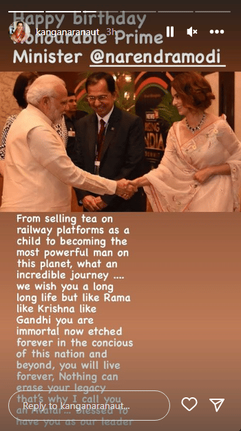 अभिनेत्री कंगना रणौत ने अपने आधिकारिक इंस्टाग्राम हैंडल से पीएम को बधाई दी है। उन्होंने अपनी इंस्टा स्टोरी पर पीएम मोदी के साथ अपनी एक तस्वीर साझा की है। इसके साथ उन्होंने लिखा है, 'शानदार पीएम को जन्मदिन मुबारक।' साथ ही लिखा है, 'बचपन में रेलवे प्लेटफॉर्म पर चाय बेचने से आज दुनिया के सबसे शक्तिशाली शख्स बनने तक आपकी यात्रा अविश्वसनीय रही है। हम आपके लंबे जीवन की कामना करते हैं,लेकिन राम की तरह, कृष्ण की तरह, गांधी की तरह, आप अमर हैं। आपकी विरासत को कोई मिटा नहीं सकता, इसलिए मैं आपको अवतार कहती हूं... आपको हमारे नेता के रूप में पाकर धन्य हो गए।'