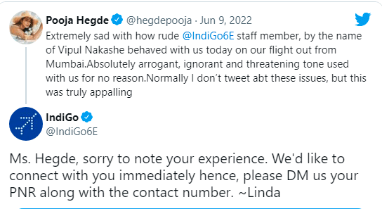 इंडिगो ने माफी मांगते हुए अभिनेत्री के ट्वीट का जवाब दिया। एयरलाइंस कंपनी ने लिखा- मिस हेगड़े, इस बुरे अनुभव के लिए हम आपसे माफी मांगते हैं। हम आपसे तुरंत ही कनेक्ट होते हैं, कृपया आप हमें अपना कांटेक्ट नंबर दें। भले ही इंडिगो ने इस बात पर माफी मांग ली हो लेकिन अब पूजा हेगड़े को सोशल मीडिया पर ट्रोल किया जा रहा है। इस बात के सामने आने के बाद लोगों के अलग-अलग रिएक्शन सामने आ रहे हैं।