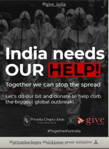 बता दें कि प्रियंका ने गुरुवार को एक वीडियो साझा किया था। इस वीडियो में उन्होंने कहा कि, 'भारत के लिए हम सभी को एक साथ आने की जरूरत है। डोनेशन और सपोर्ट के लिए आप सभी का शुक्रिया। आप सभी का योगदान भारत के लिए कोविड19 से जंग लड़ने में काम आएगा। अभी बहुत कुछ करना बाकी है। इसके साथ ही उन्होंने कहा कि उम्मीद करती हूं कि जो ये चीजें चलाई हैं वो कायम रहे। अभी डोनेट करें नीचे लिंक दिया गया है'। इसके अलावा उन्होंने एक वीडियो और साझा किया था जिसमें वो भारत के लिए मदद मांगती नजर आ रहीं थीं।