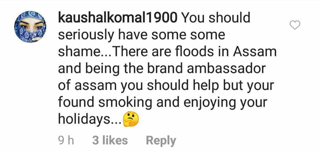 एक यूजर ने लिखा, 'प्रियंका ने ग्लव्स क्यों पहने हैं । ये आज का ट्रेंड नहीं है ।' दूसरे यूजर ने लिखा, 'बिकिनी के साथ ग्लव्स कौन पहनता है ।' वहीं असम की ब्रांड अंबेसडर होने पर एक यूजर ने लिखा, 'क्या आपको जरा भी शर्म है । असम में बाढ़ आई हुई है । असम की ब्रांड अंबेसडर होने के नाते आपको वहां के लोगों की मदद करनी चाहिए । लेकिन आप तो वहां स्मोक और एंज्वॉय कर रही हैं ।'