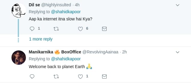 किसी यूजर्न ने लिखा- 'इंटरनेट इतना स्लो है क्या..??' तो वहीं दूसरे ने लिखा- 'बस सुना... मंगल ग्रह पर थे क्या..??' इस तरह कई सोशल मीडिया यूजर्स ने शाहिद कपूर को उनके इस ट्वीट की वजह से ट्रोल कर दिया है। इसके अलावा उनके भद्दे कमेंट का भी सामना करना पड़ रहा है।
