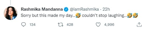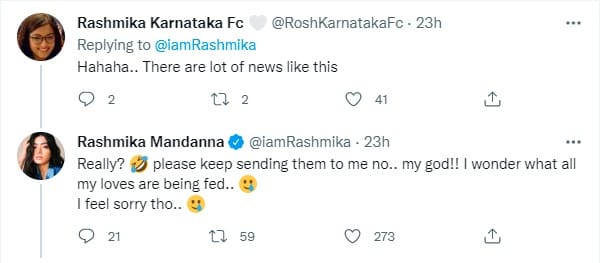 रश्मिका के इस ट्वीट के बाद उनके एक फैन पेज ने लिखा कि इस तरह की बहुत से खबरें हैं। इस पर रश्मिका ने जवाब दिया, 'सच में, प्लीज मुझे ऐसी चीजें भेजते रहने। मुझे हैरानी है कि मेरे चाहने वालों को मेरे बारे में क्या जानकारी दी जा रही है, इसका मुझे खेद है।' फैंस भी रश्मिका के इस ट्वीट पर मजेदार प्रतिक्रिया दे रहे हैं।