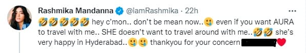 दरअसल, रश्मिका मंदाना ने ट्वीट करते हुए लिखा, 'अब चलो...इतने मतलबी मत बनो। अगर आप ऑरा (पेट डॉग) को मेरे साथ ट्रैवल कराना चाहोगे तो भी वो मेरे साथ नहीं जाएगी। वह हैदराबाद में खुश है। आपकी इतनी चिंता के लिए धन्यवाद।' इसके बाद रश्मिका ने एक और ट्वीट किया और लिखा, 'सॉरी, लेकिन इसने मेरा दिन बना दिया। मैं अपनी हंसी को रोक ही नहीं पा रही हूं।'