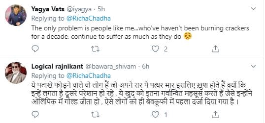 ऋचा के इस पोस्ट पर कई लोगों ने कमेंट किए हैं। एक यूजर ने लिखा कि मेरे जैसे लोगों को इससे काफी परेशानी होती है जो पिछले कई सालों से एक भी पटाखा नहीं फोड़ रहा है लेकिन इसके बाद भी परेशान होता है। वहीं एक और यूजर ने लिखा, 'ये पटाखे फोड़ने वाले वो लोग हैं जो अपने सर पे पत्थर मार इसलिए ख़ुश होते हैं क्यों कि इन्हें लगता है दूसरे परेशान हो रहे , ये खुद को इतना गर्वान्वित महसूस करते हैं जैसे इन्होंने ओलिंपिक में गोल्ड जीता हो , ऐसे लोगों को ही बेवकूफी में पहला दर्जा दिया गया है ।'