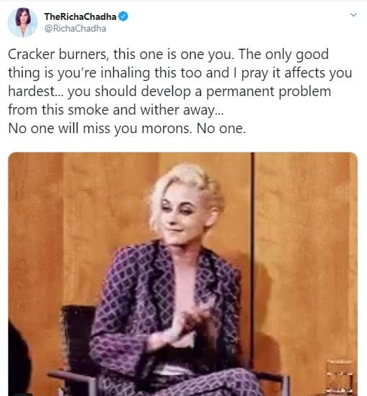 ऋचा ने ट्विटर पर एक जिफ शेयर करते हुए पटाखे जलाने वालों पर सीधा हमला किया है। ऋचा ने लिखा, 'पटाखे जलाने वालों, ये तुम्हारे लिए है। सबसे अच्छी बात है कि तुम भी इस गंदी हवा में सांस ले रहे हो। मैं दुआ करती हूं कि इसका तुम पर भयानक असर हो और इससे तुम्हें हमेशा के लिए कोई गंभीर बड़ी बीमारी हो जाए। बेवकूफों तुम्हारे जाने के बाद तुम्हें कोई याद नहीं करेगा, कोई भी नहीं।'