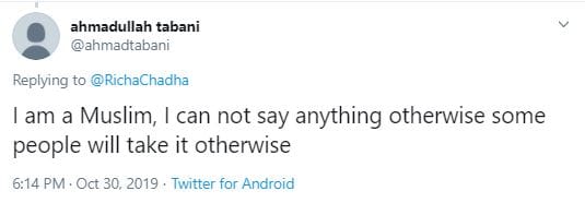इन सभी कमेंट्स के अलावा एक यूजर ने कमेंट किया कि मैं एक मुस्लिम हूं और इस बारे में कुछ नहीं कह सकता। अगर मैंने इस बारे में कुछ कहा तो लोग उसे गलत लहजे में ले लेंगे। गौरतलब है कि प्रोफेशनल कमिटमेंट्स के अलावा ऋचा अली फजल के साथ रिलेशनशिप की खबरों को लेकर भी सुर्खियों में रहती हैं।
