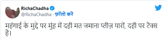 अभिनेत्री ऋचा चड्ढा सोशल मीडिया पर काफी एक्टिव रहती हैं। वह अक्सर मुद्दों पर अपनी राय देती नजर आती हैं। अनुराग कश्यप से पहले उन्होंने भी जीएसटी काउंसिल द्वारा लागू किए गए नए जीएसटी और मौजूदा जीएसटी दरों को बढ़ाकर लागू करने को लेकर अपनी प्रतिक्रिया दी थी। ऋचा ने एक ट्वीट करते हुए तीखा तंज कसा। दरअसल उन्होंने एक ट्वीट को रिट्वीट करते हुए सरकार पर निशाना साधा। ऋचा चड्ढा ने लिखा, 'महंगाई के मुद्दे पर मुंह में दही मत जमाना प्लीज यारों, दही पर टैक्स है।'