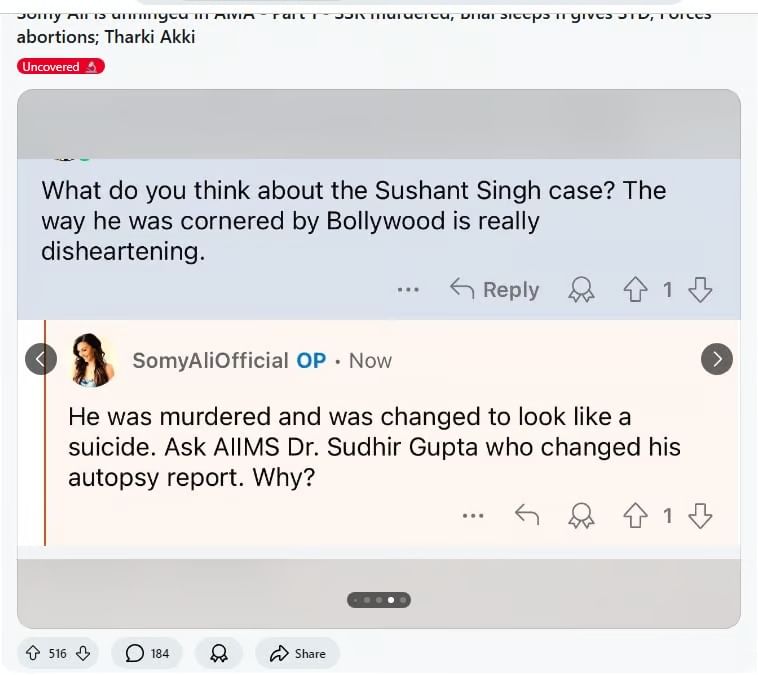 एएमए सत्र के दौरान सोमी से पूछा गया, "सुशांत सिंह मामले के बारे में आप क्या सोचती हैं? जिस तरह से बॉलीवुड ने उन्हें घेर लिया, वह वाकई निराशाजनक है।" इस पर सोमी ने जवाब दिया, "उनकी हत्या की गई थी और इसे आत्महत्या का रूप देने के लिए बदल दिया गया था। एम्स के डॉ. सुधीर गुप्ता से पूछिए जिन्होंने उनकी पोस्टमार्टम रिपोर्ट बदली। क्यों?"