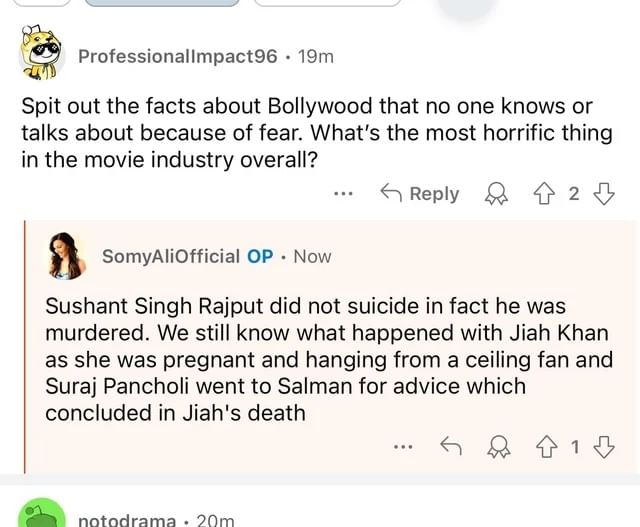 सोमी के जवाब के स्क्रीनशॉट सोशल मीडिया प्लेटफॉर्म पर वायरल रहे हैं। एक अन्य रेडिट यूजर ने सोमी से पूछा, "आप पिछले रिश्ते की अभी की स्थिति को कैसे देखती हैं? जीवन के इस फेज में आप किस न्याय की उम्मीद कर रही हैं?" इस पर अभिनेत्री ने जवाब दिया, "सुशांत सिंह राजपूत, जिया खान और अन्य के लिए न्याय की जरूरत है। रवींद्र पाटिल के बारे में क्या ख्याल है? गूगल पर देखें कि उनके साथ क्या हुआ था।"