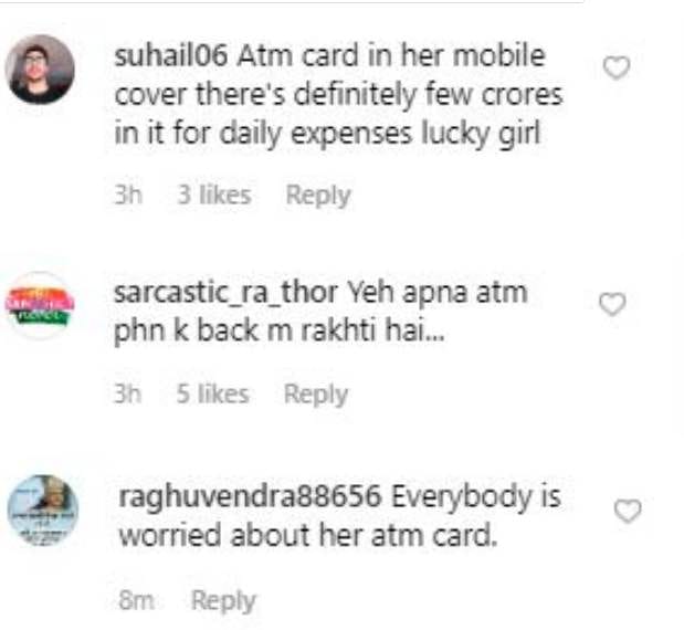 यूजर्स ने कहा कि उन्होंने जो कार्ड अपने फोन के कवर में रखा है उसमें करोड़ों रुपए होंगे । एक यूजर ने लिखा, 'सुहाना को ये करोड़ों रुपए वाला एटीएम कार्ड अपने रोज के खर्चों के लिए मिला है । कितनी लकी है वो' । वहीं दूसरे यूजर ने लिखा, 'ये अपना एटीएम फोन के पीछे रखती है । सभी को सुहाना के एटीएम कार्ड की चिंता है ।'