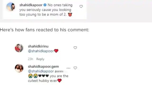 अभिनेता शाहिद कपूर ने भी मीरा राजपूत के वीडियो पर मजेदार कमेंट किया है। शाहिद कपूर ने अपने कमेंट में मीरा राजपूत के लिए लिखा, 'कोई तुम्हें गंभीरता से नहीं ले रहा क्योंकि तुम दो बच्चों की मां बिल्कुल नहीं लग रही हो।' शाहिद कपूर के इस कॉमेंट को कई सोशल मीडिया यूजर्स और उनके फैंस काफी पसंद कर रहे हैं।