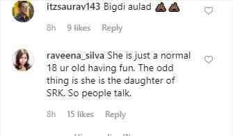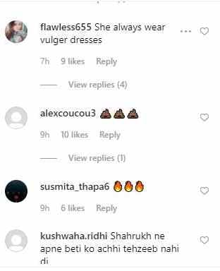एक यूजर ने कहा, 'सुहाना हमेशा ऐसे अश्लील कपड़े पहनती है ।' वहीं एक और यूजर लिखते हैं, 'शाहरुख ने अपनी बेटी को अच्छी तहजीब नहीं दी।' वहीं कुछ यूजर्स ने सुहाना को सपोर्ट भी किया । एक यूजर ने लिखा है, 'सुहाना एक नॉर्मल 18 साल की लड़की है, जो फन कर रही है। बस बात ये है कि वे शाहरुख की बेटी है, इसलिए लोग बात कर रहे हैं।'