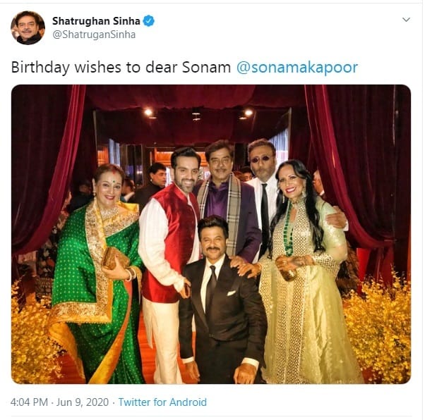 शत्रुघ्न सिन्हा ने ट्विटर पर सोनम कपूर को जन्मदिन की बधाई दी थी। उन्होंने जो तस्वीर साझा की थी, उसमें शत्रुघ्न सिन्हा और उनकी पत्नी और बेटे के अलावा जैकी श्रॉफ उनकी पत्नी और अनिल कपूर नजर आ रहे थे, लेकिन सोनम कपूर कहीं नजर नहीं आई। सोशल मीडिया यूजर्स ने शत्रुघ्न सिन्हा के इस ट्वीट के बाद उनको ट्रोल करना शुरू कर दिया।