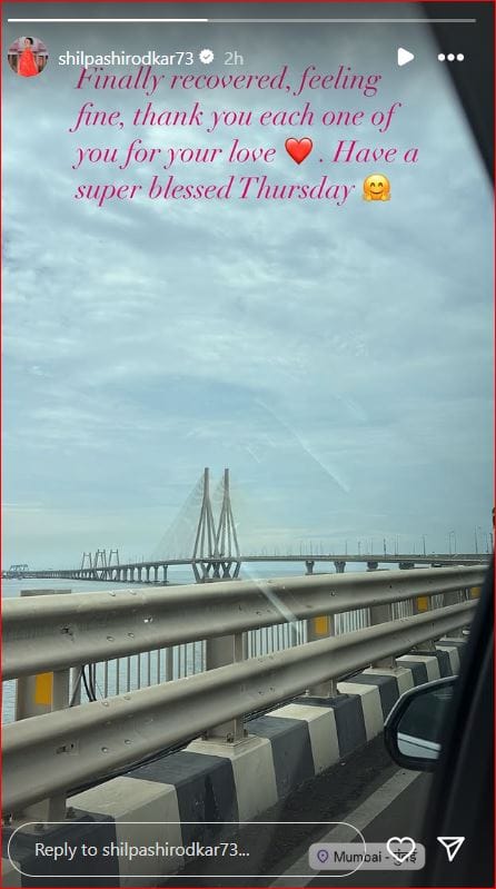 शिल्पा ने आज इंस्टाग्राम स्टोरी पर अपनी हेल्थ अपडेट को लेकर एक पोस्ट शेयर किया है, जिसमें उन्होंने लिखा, 'आखिरकार ठीक हो गई, अच्छा महसूस कर रही हूं, आपके प्यार के लिए धन्यवाद। गुरुवार का दिन बहुत अच्छा रहे।'