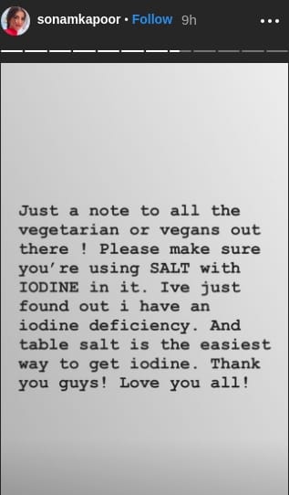 सोनम कपूर ने हाल ही में खुलासा किया है कि उनके शरीर में आयोडीन की कमी है। उन्होंने ये बात इंस्टाग्राम स्टोरी के जरिए बताई है। उन्होंने अपनी इंस्टा स्टोरी पर लिखा- 'सभी शाकाहारी लोगों के लिए एक नोट! कृपया सुनिश्चित करें कि आप आयोडीन युक्त नमक इस्तेमाल करें। मुझे पता चला है कि मेरे अंदर आयोडीन की कमी है।' सोनम कपूर की इस पोस्ट पर उनके फैंस प्रतिक्रिया दे रहे हैं।