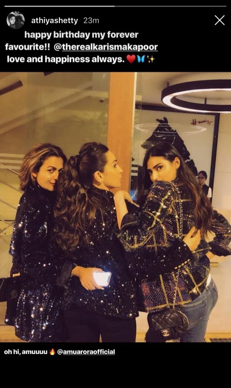 'हीरो' फिल्म की एक्ट्रेस और स्टार किड अथिया शेट्टी ने भी करिश्मा को सोशल मीडिया के जरिए उन्हें जन्मदिन की बधाई दी है। इंस्टा स्टोरी पर शेयर की गई तस्वीर में अथिया के साथ करिश्मा कपूर और अमृता अरोड़ा नजर आई हैं। इसके अलावा और भी कई बॉलीवुड सितारों ने करिश्मा को जन्मदिन की बधाई दी है।
