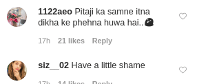 एक यूजर ने लिखा- 'पिताजी के सामने इतना दिखा के पहना हुआ है।' एक अन्य ने लिखा- 'क्या थोड़ी सी शर्म है?'