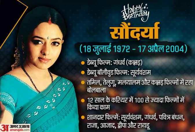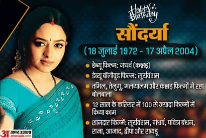 अपने अभिनय से दर्शकों के दिलों को जीतने वालीं और फिल्मी पर्दे पर अमिट छाप छोड़ने वालीं मशहूर अभिनेत्री सौंदर्या का जन्मदिन 18 जुलाई को होता है। सौंदर्या साउथ सिनेमा की शानदार अभिनेत्रियों में से एक थीं। उनकी लोकप्रियता का आलम यह था कि फिल्म में उनकी झलक देखते ही लोग पागल हो जाते थे। साउथ फिल्म इंडस्ट्री में सौंदर्या की तुलना बॉलीवुड अभिनेत्री हेमा मालिनी से होती थी। उन्हें साउथ की ड्रीम गर्ल कहा जाता था।