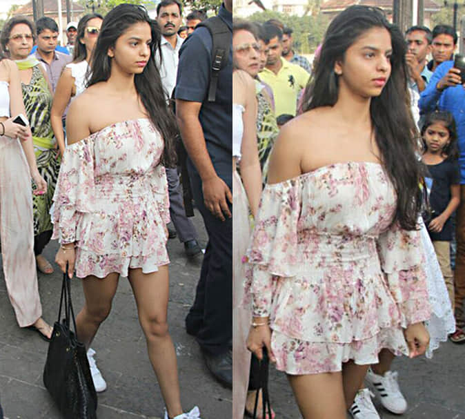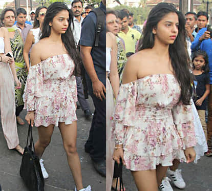 पार्टी के बाद सुहाना मुंबई लौटीं और गेटवे ऑफ इंडिया पर स्पॉट की गईं। सुहाना की ड्रेस देख वहां खड़े लोग उन्हें घूरने लगे। सुहाना ने ऑफ शोल्डर शॉर्ट ड्रेस पहनी हुई थी। शिफॉन की इस ड्रेस में सुहाना बेहद खूबसूरत लग रही थीं।