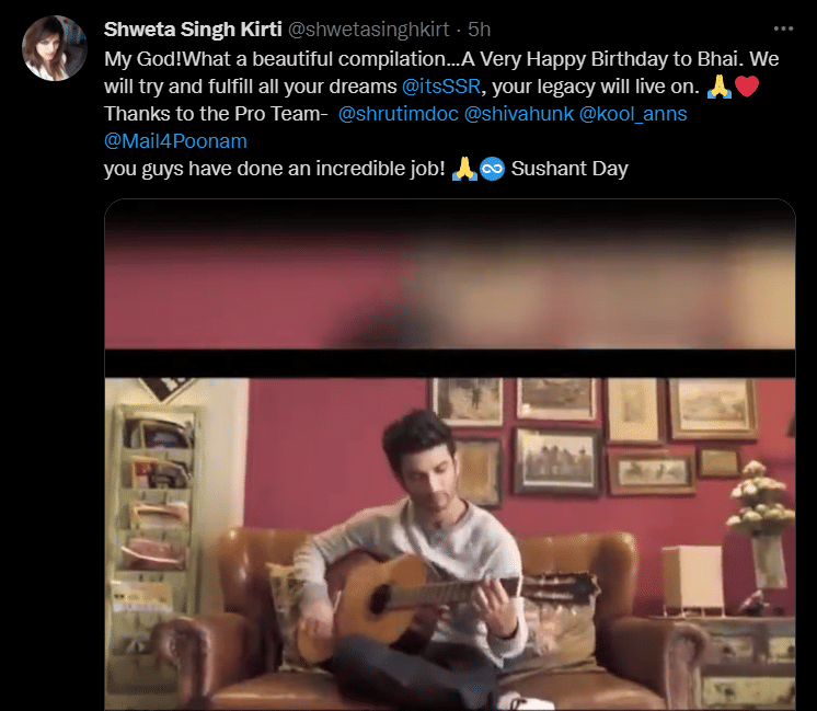 वीडियो में इस्तेमाल किया गया बैकग्राउंड म्यूजिक उनकी फिल्म केदारनाथ के 'जय हो शंकरा' गाने का है। इस वीडियो में दिखाया गया है कि सुशांत दूसरों से अलग क्यों थे। श्वेता ने सोशल मीडिया पर यह वीडियो साझा करते हुए लिखा, "माई गॉड! क्या खूबसूरत संकलन है ... भाई को जन्मदिन की बहुत बहुत शुभकामनाएं। हम आपके सभी सपनों को पूरा करने की कोशिश करेंगे सुशांत, आपकी विरासत जीवित रहेगी। प्रो टीम को धन्यवाद, आप लोगों ने अविश्वसनीय काम किया है! #सुशांतदिवस।" बता दें कि श्वेता और सुशांत के कई प्रशंसकों ने सुशांत के जन्मदिन को अपना दिन घोषित किया है, वे इसे 'सुशांत दिवस' कहते हैं।